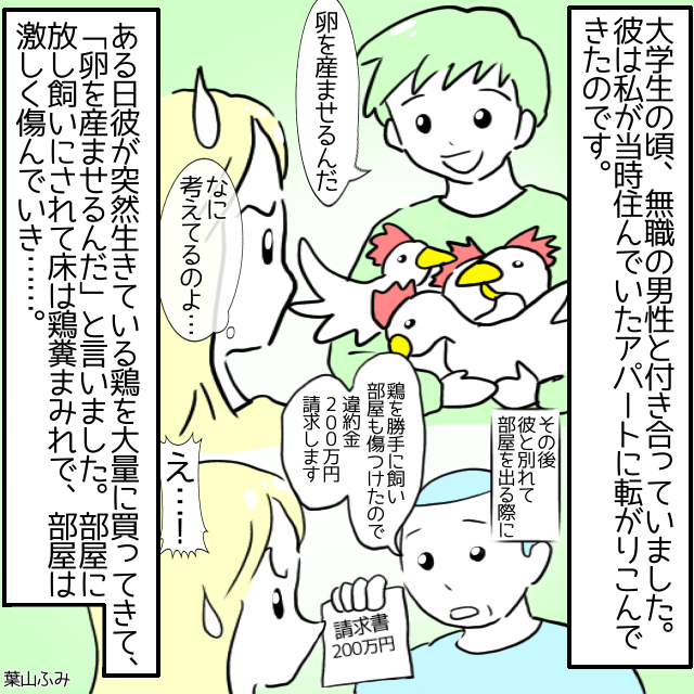 大学時代に付き合っていた彼氏が鶏を大量に買って、アパートの部屋で放し飼いしたことで、退去の際に違約金などで200万円も請求されてしまったという体験談。