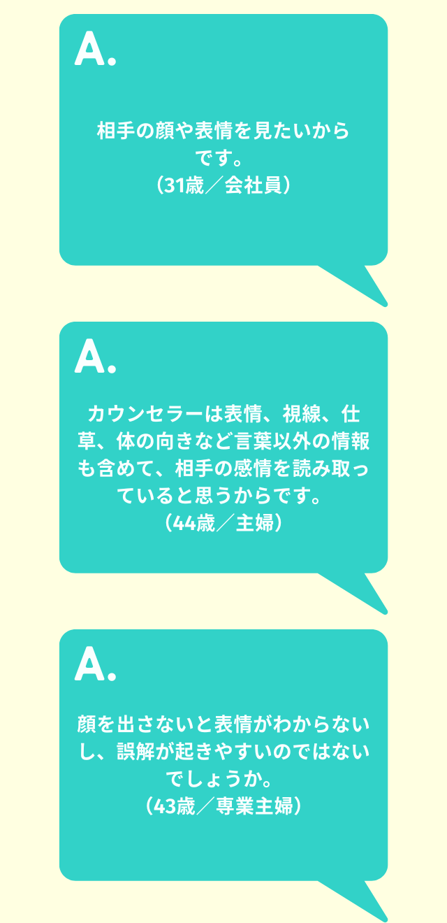 「顔出ししない」といった特徴が、カウンセリングのハードルを下げると考えられる一方で、表情がわからないことに不安を感じる方も。