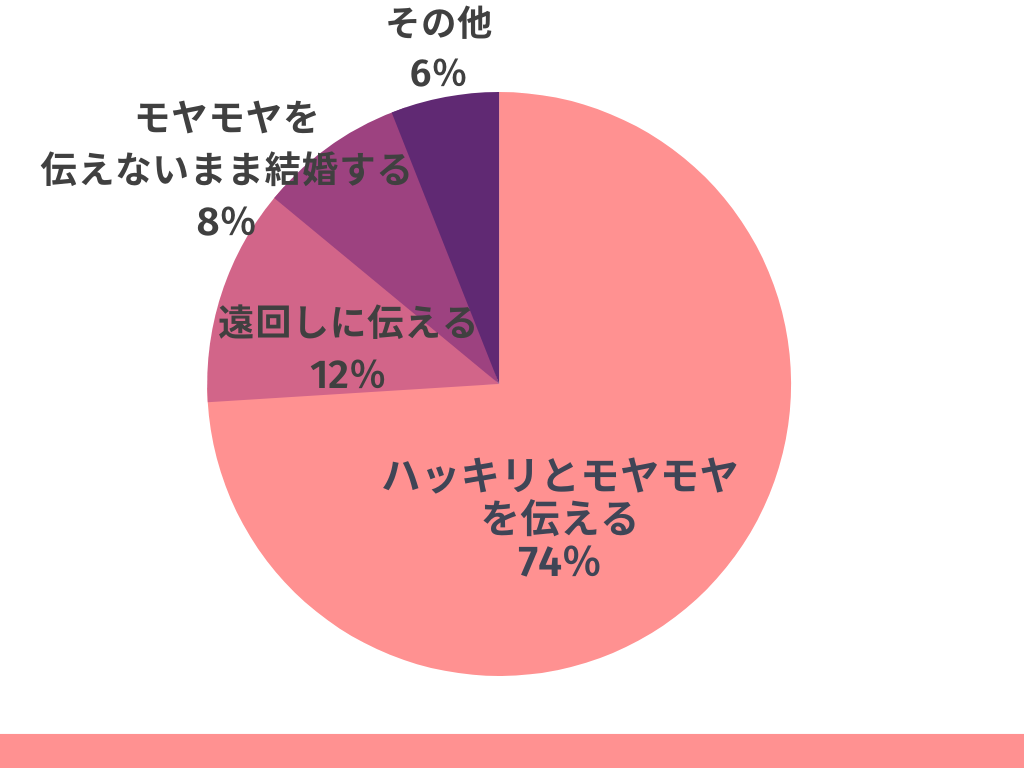 『「結婚しよう」って言われていない……このモヤっとは伝えるべき?』という質問に対し、最も多かった答えは「ハッキリとモヤモヤを伝える」で74%。