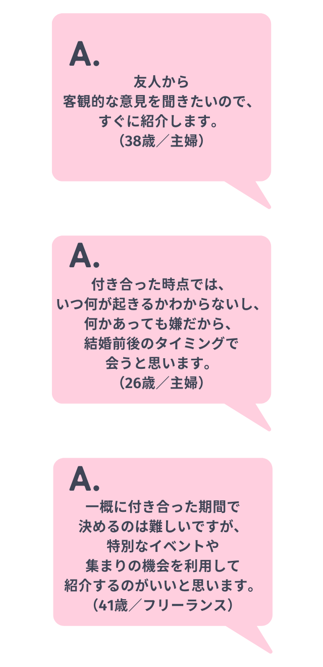 「付き合ってすぐ」という方もいれば「紹介しない」「結婚が決まってから」という方もいて、ベストなタイミングは人それぞれ異なるようです。