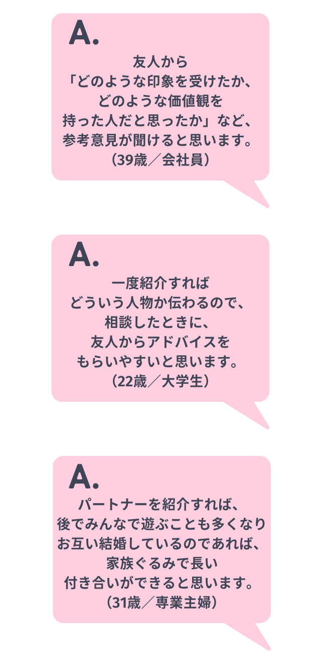 友人に紹介するメリットとして、「パートナーとのことを相談しやすい」といった意見が多く寄せられていました。