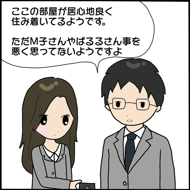 T田さんの『ここ、3人住んでますよ』という言葉に恐怖を抱くも、その後の言葉に胸をなで下ろしたM子さん。