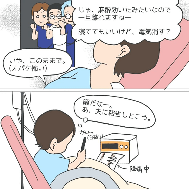 その後陣痛を感じたことから産院へ向かい、ついに無痛分娩の“麻酔処置”を乗り越えたママぺいさん。