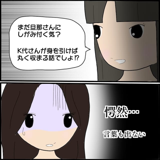 その後の話で、K代さんは『離婚はしない』と断言していた夫の態度に不信感を覚えるように。ついに嫌気がさしたK代さんは夫との離婚を決意します!