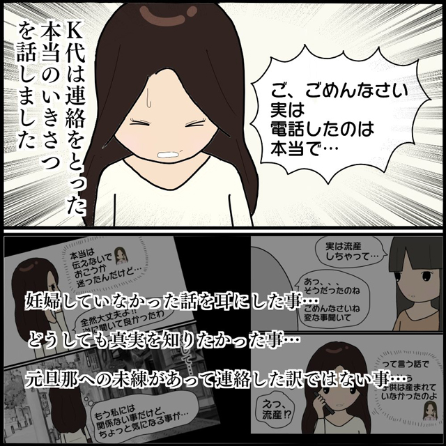 ある日、M子さんから「怖美が流産していた」と聞かされたK代さん。元夫に真相を尋ねると、怖美は身勝手な理由で妊娠を偽っていたと知ります。