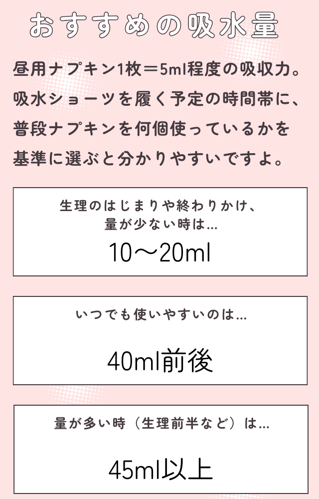 ショーツによって吸水量が異なり、10ml~140ml程度のものまであります。