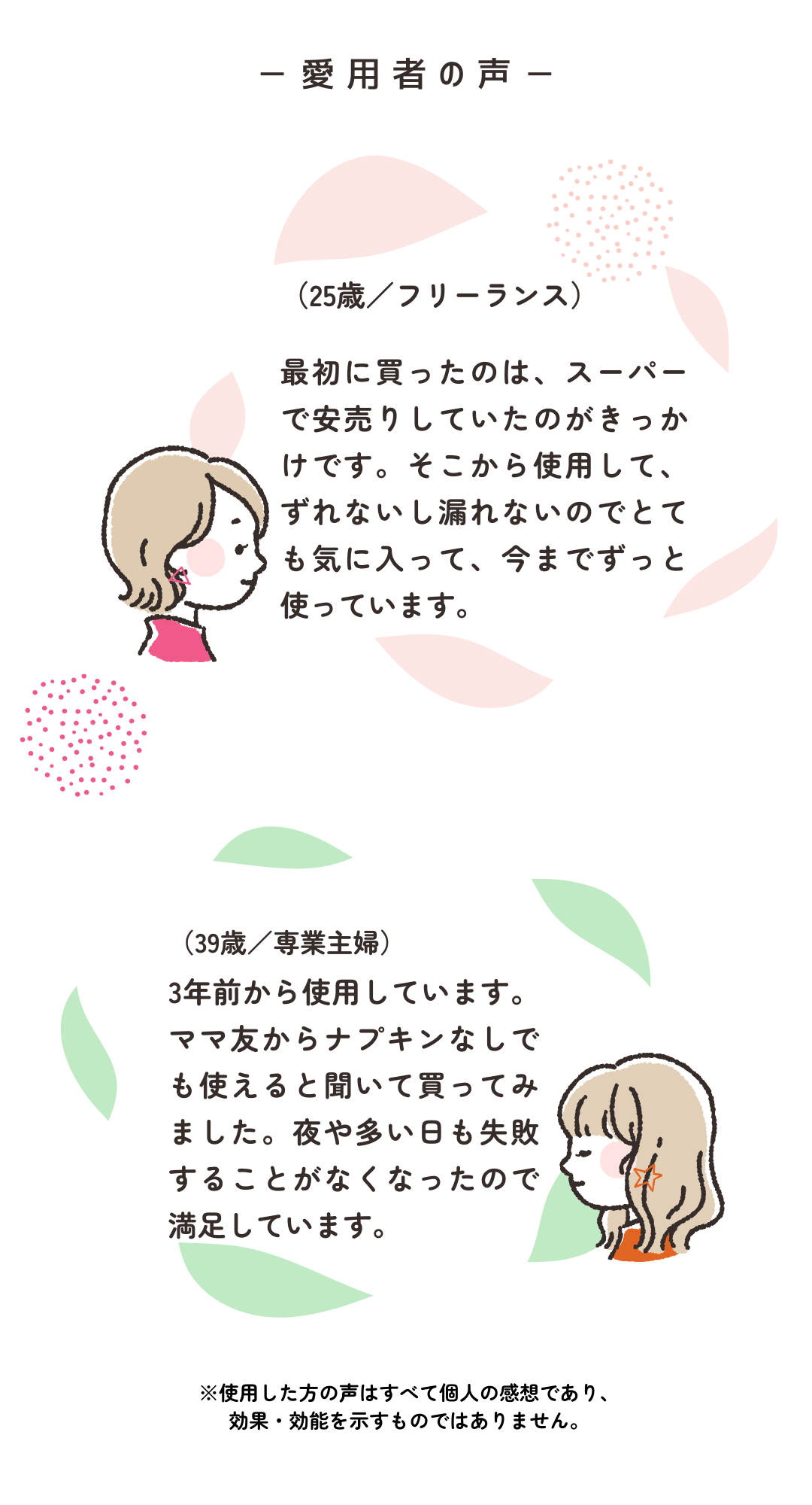 生理が来そうな時や、生理の終わりがけで、しっかりナプキンを付けるほどではないけど下着を汚したくない時にまずはおすすめです。