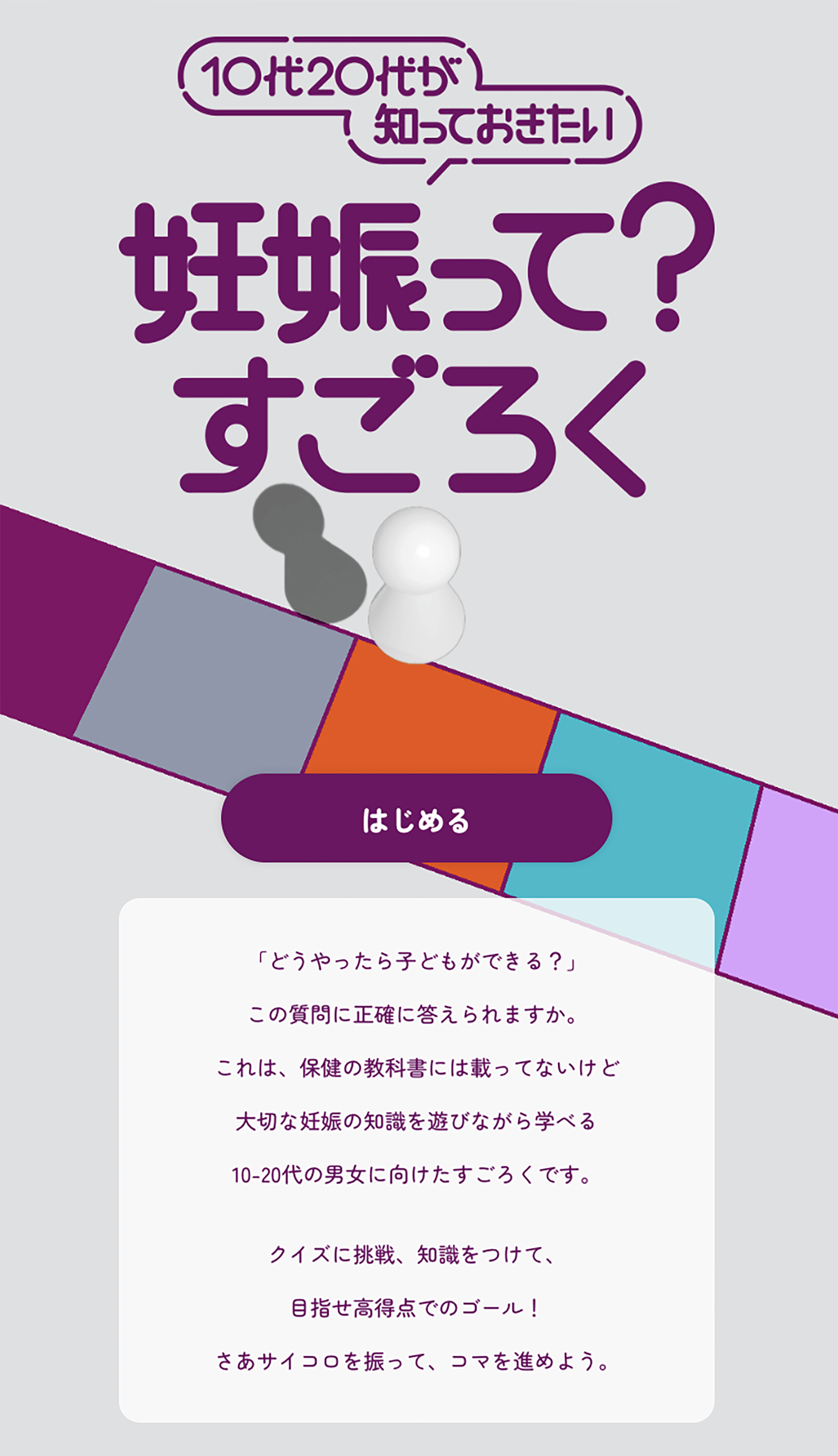 10~20代の間に知っておきたい妊娠に関する知識を、スマホで遊びながら楽しく学べる性教育コンテンツです。
