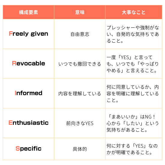 特に重要なのは「E(前向きなYES)」と「R(いつでも撤回できる)」です。