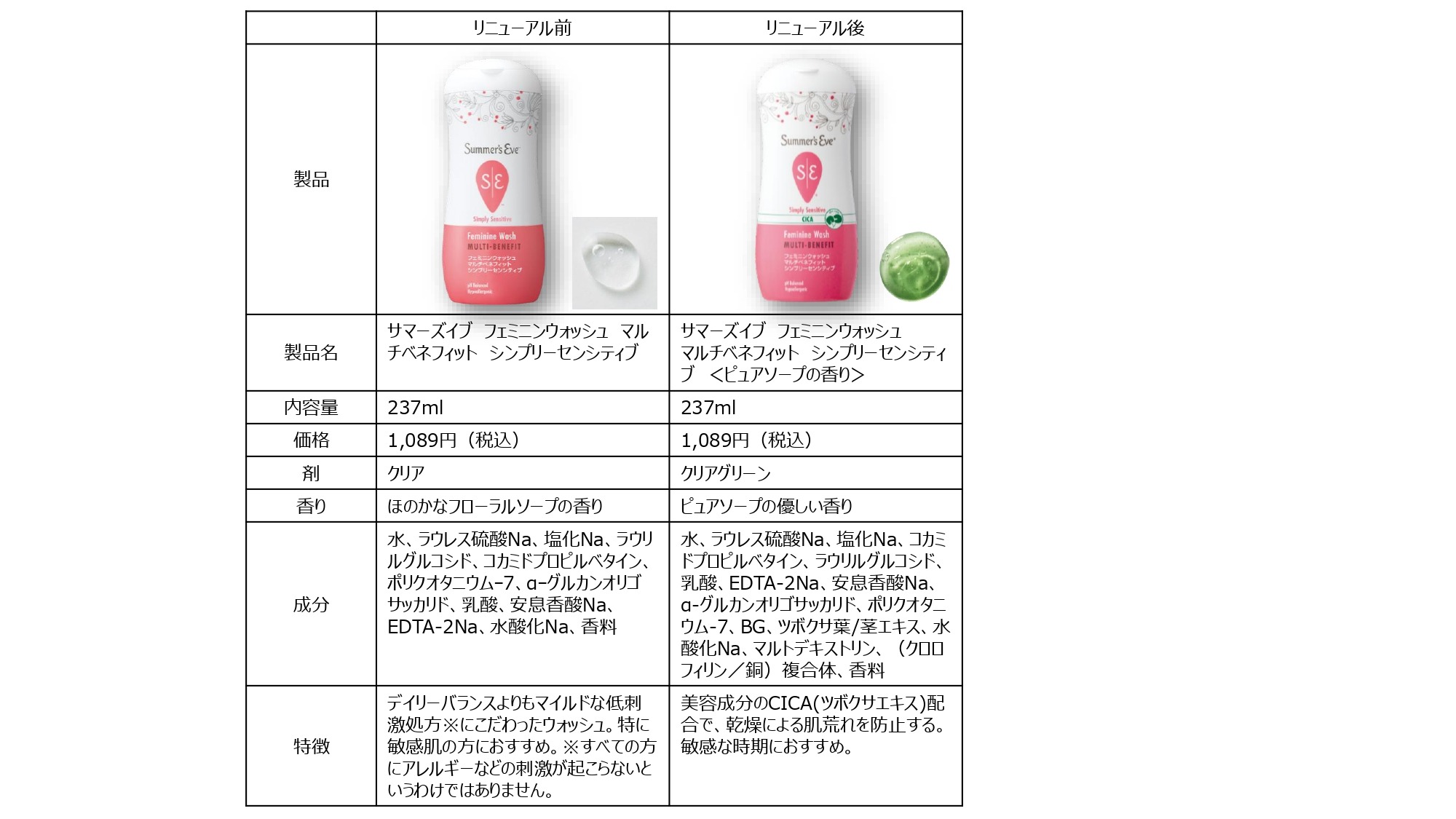 ピルボックスジャパン株式会社のデリケートゾーンケアブランド「Summer’s Eve(サマーズイブ)」から、敏感肌向けのフェミニンウォッシュ「サマーズイブ フェミニンウォッシュ マルチベネフィット シンプリーセンシティブ<ピュアソープの香り>」が、人気の美容成分CICA(ツボクサエキス)配合のリニューアル版として、2026年5月11日より新発売することが発表されました。